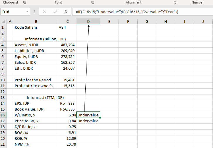 Misalnya saya aplikasikan fungsi if dalam analisis saham sederhana. Masih lanjutkan fungsi vlookup diatas, namun kali ini saya mencoba ambil bagian tertentu saya misalnya data TTM pada baris 14-21. Katakanlah saya ingin membandingkan matrik p/e ratio dan Price BV saham ASII dengan yang saya inginkan yaitu misalnya PE dibawah 15x adalah undervalue, PE diatas 15x adalah overvalue dan 15x adalah Fear, begini hasilnya.