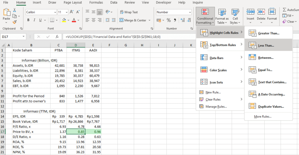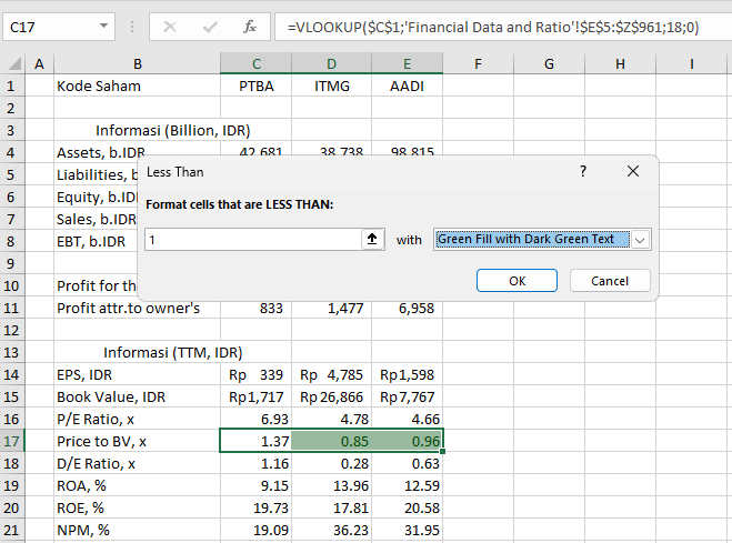 Masih menggunakan data yang sama, namun saya ambil metril Price BV (PBV) dari 3 saham batu bara yaitu PTBA, ITMG dan AADI. Disini saya ingin menandai dan memberi label hijau apabila PBV dibawah 1x, dengan cara yang sama, yaitu klik pada menu Conditional Formating >> Highligh Cell Rules >> Less Than pilih kriteria atau ketik 1, atur cell sesuai warna yang dinginkan (Green Fill with Dark Green Text), maka hasilnya seperti dibawah ini: