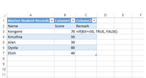2.Dalam sel C3, tulis fungsi bersyarat Jika (B3>=50;True();False()) untuk excel 2010 kebawah, jika Anda menggunakan versi diatas 2010, maka tulis rumus sesuai dengan gambar ini ya