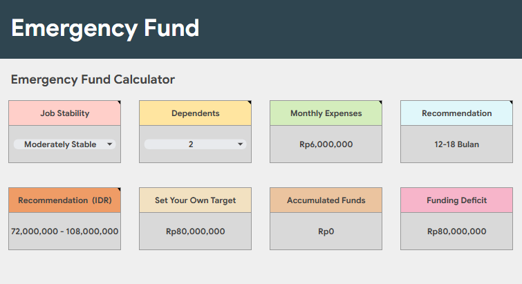 Template ini bantu kamu hitung dan tracking dana darurat berdasarkan status: